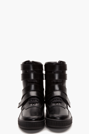 HIGH CALF-LENGTH BLACK LEATHER SNEAKERS. ROUND TOE WITH PERFORATED DETAIL. LACE UP TIE WITH FOUR VELCRO CROSS WRAPS. LOGO PRINT AT SIDE. PADDED TONGUE AND TOP LINE. TONAL TOP STITCHING. MULTI-TEXTURED RUBBER SOLE. 100% LEATHER. MADE IN ITALY.